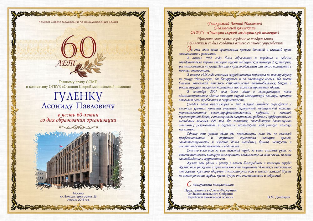 Поздравительный адрес с юбилеем